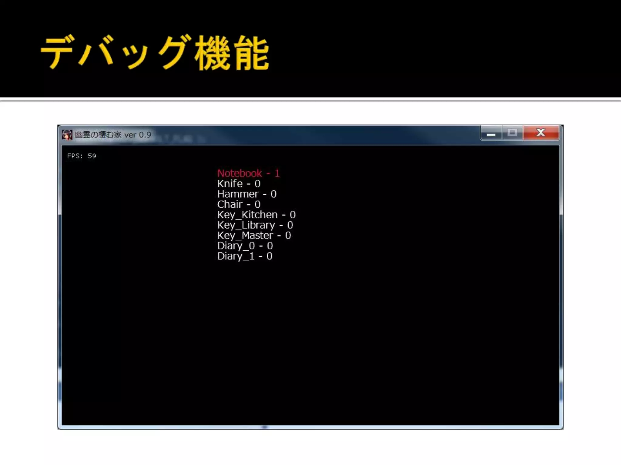 ゲーム内から1ボタン/キーでデバッグメ ニューに飛べる様にしていました デバッグ画面中はゲームの進行は止って います(更新、描画が呼ばれていません)