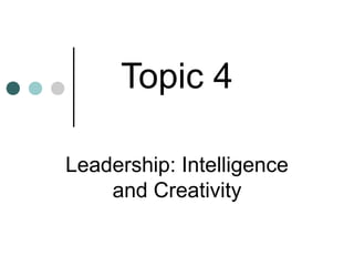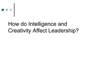 Intelligence and creativity both impact leadership effectiveness. Leaders need cognitive abilities like problem-solving skills as well as knowledge of their industry. More intelligent leaders tend to learn faster, develop better strategies and solutions, and think more implications of decisions. While intelligence is important, it must be combined with experience, stress tolerance, and emotional intelligence. Creativity in leadership involves generating new ideas and implementing innovations. Leaders can foster creativity by encouraging diverse perspectives, rewarding novel ideas, and empowering followers.