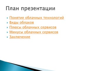 Презентация освещает облачные технологии, их виды, плюсы и минусы. Облачные сервисы предоставляют пользователям доступ к данным из любой точки мира, снижая необходимость в дорогостоящем оборудовании и IT-специалистах. Однако, хранение ценной информации на публичных облаках связано с рисками утечки данных и отсутствием 100% конфиденциальности.