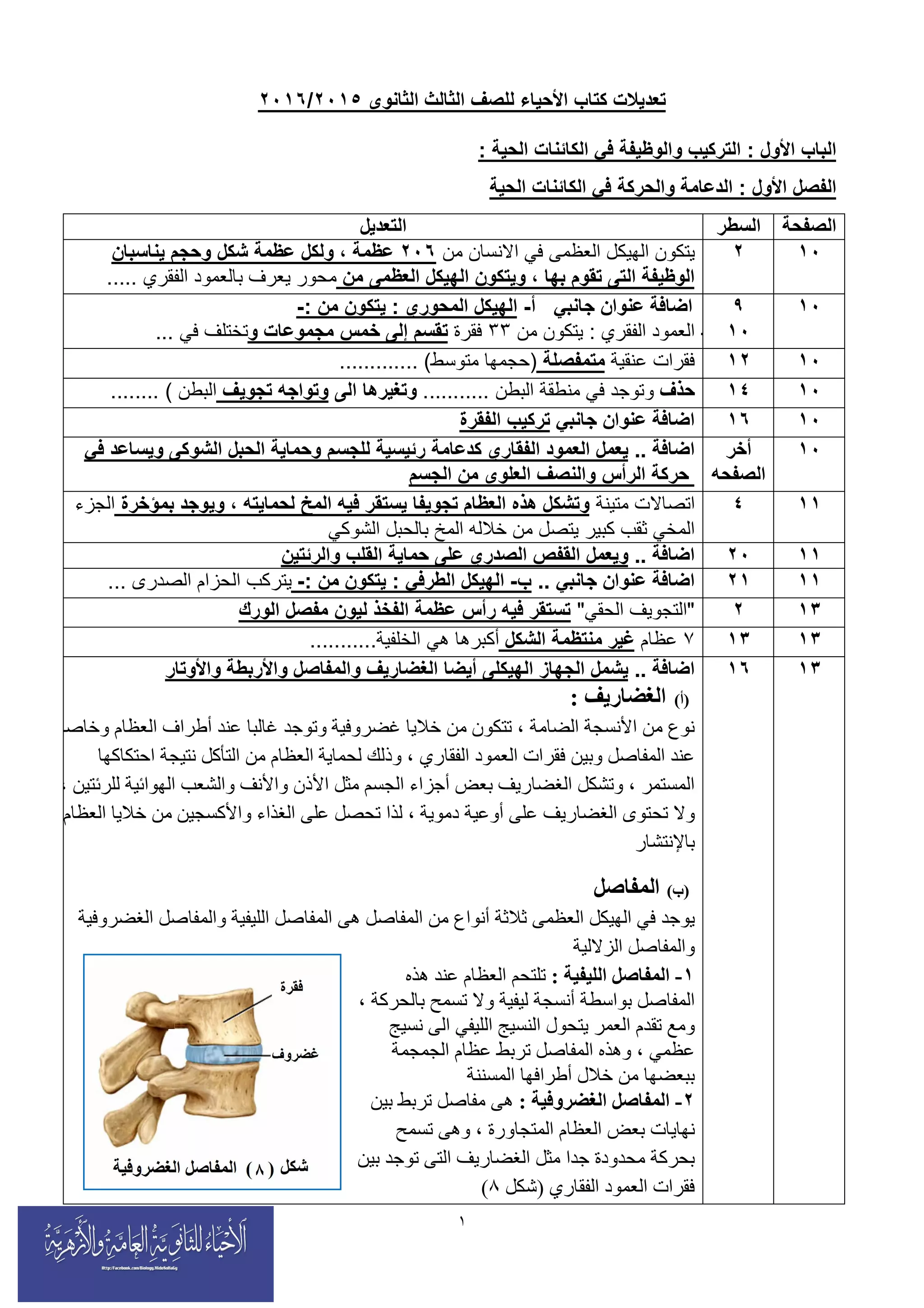 اﻷﺣﯾﺎء ﻛﺗﺎب ﺗﻌدﯾﻼت٢٠١٥/٢٠١٦ اﻷول اﻟﺑﺎب:اﻟﺣﯾﺔ اﻟﻛﺎﺋﻧﺎت ﻓﻲ واﻟوظﯾﻔﺔ اﻟﺗرﻛﯾب: اﻷول اﻟﻔﺻل:اﻟاﻟﺣﯾﺔ اﻟﻛﺎﺋﻧﺎت ﻓﻲ واﻟﺣرﻛﺔ دﻋﺎﻣﺔ اﻟﺻﻔﺣﺔاﻟﺳطراﻟﺗﻌدﯾل ١٠٢ﻣن اﻻﻧﺳﺎن ﻓﻲ اﻟﻌظﻣﻰ اﻟﮭﯾﻛل ﯾﺗﻛون٢٠٦ﯾﻧﺎﺳﺑﺎن وﺣﺟم ﺷﻛل ﻋظﻣﺔ وﻟﻛل ، ﻋظﻣﺔ ﻣن اﻟﻌظﻣﻰ اﻟﮭﯾﻛل وﯾﺗﻛون ، ﺑﮭﺎ ﺗﻘوم اﻟﺗﻰ اﻟوظﯾﻔﺔاﻟﻔﻘري ﺑﺎﻟﻌﻣود ﯾﻌرف ﻣﺣور..... ١٠٩ ١٠ أ ﺟﺎﻧﺑﻲ ﻋﻧوان اﺿﺎﻓﺔ-اﻟﻣﺣوري اﻟﮭﯾﻛل:ﻣن ﯾﺗﻛون:- -اﻟﻔﻘري اﻟﻌﻣود:ﻣن ﯾﺗﻛون٣٣ﻓﻘرةو ﻣﺟﻣوﻋﺎت ﺧﻣس إﻟﻰ ﺗﻘﺳمﻓﻲ ﺗﺧﺗﻠف... ١٠١٢ﻋﻧﻘﯾﺔ ﻓﻘراتﻣﺗﻣﻔﺻﻠﺔ)ﻣﺗوﺳط ﺣﺟﻣﮭﺎ............. ( ١٠١٤ﺣذفاﻟﺑطن ﻣﻧطﻘﺔ ﻓﻲ وﺗوﺟد...........اﻟﻰ وﺗﻐﯾرھﺎﺗﺟوﯾف وﺗواﺟﮫاﻟﺑطن........ ( ١٠١٦ﺟﺎﻧﺑﻲ ﻋﻧوان اﺿﺎﻓﺔاﻟﻔﻘرة ﺗرﻛﯾب ١٠أﺧر اﻟﺻﻔﺣﮫ اﺿﺎﻓﺔ..ﻓﻲ وﯾﺳﺎﻋد اﻟﺷوﻛﻰ اﻟﺣﺑل وﺣﻣﺎﯾﺔ ﻟﻠﺟﺳم رﺋﯾﺳﯾﺔ ﻛدﻋﺎﻣﺔ اﻟﻔﻘﺎري اﻟﻌﻣود ﯾﻌﻣل اﻟﺟﺳم ﻣن اﻟﻌﻠوى واﻟﻧﺻف اﻟرأس ﺣرﻛﺔ ١١٤ﻣﺗﯾﻧﺔ اﺗﺻﺎﻻتﺑﻣؤﺧرة وﯾوﺟد ، ﻟﺣﻣﺎﯾﺗﮫ اﻟﻣﺦ ﻓﯾﮫ ﯾﺳﺗﻘر ﺗﺟوﯾﻔﺎ اﻟﻌظﺎم ھذه وﺗﺷﻛلاﻟﺟزء اﻟﺷوﻛﻲ ﺑﺎﻟﺣﺑل اﻟﻣﺦ ﺧﻼﻟﮫ ﻣن ﯾﺗﺻل ﻛﺑﯾر ﺛﻘب اﻟﻣﺧﻲ ١١٢٠اﺿﺎﻓﺔ..واﻟرﺋﺗﯾن اﻟﻘﻠب ﺣﻣﺎﯾﺔ ﻋﻠﻰ اﻟﺻدري اﻟﻘﻔص وﯾﻌﻣل ١١٢١ﺟﺎﻧﺑﻲ ﻋﻧوان اﺿﺎﻓﺔ..ب-اﻟطرﻓﻲ اﻟﮭﯾﻛل:ﻣن ﯾﺗﻛون:-اﻟﺻدرى اﻟﺣزام ﯾﺗرﻛب... ١٣٢"اﻟﺣﻘﻲ اﻟﺗﺟوﯾف"اﻟورك ﻣﻔﺻل ﻟﯾون اﻟﻔﺧذ ﻋظﻣﺔ رأس ﻓﯾﮫ ﺗﺳﺗﻘر ١٣١٣٧ﻋظﺎماﻟﺷﻛل ﻣﻧﺗظﻣﺔ ﻏﯾراﻟﺧﻠﻔﯾﺔ ھﻲ أﻛﺑرھﺎ........... ١٣١٦اﺿﺎﻓﺔ..واﻷوﺗﺎر واﻷرﺑطﺔ واﻟﻣﻔﺎﺻل اﻟﻐﺿﺎرﯾف أﯾﺿﺎ اﻟﮭﯾﻛﻠﻰ اﻟﺟﮭﺎز ﯾﺷﻣل )أ(اﻟﻐﻀﺎرﯾﻒ: وﺧﺎﺻﺔ اﻟﻌﻈﺎم أطﺮاف ﻋﻨﺪ ﻏﺎﻟﺒﺎ وﺗﻮﺟﺪ ﻏﻀﺮوﻓﯿﺔ ﺧﻼﯾﺎ ﻣﻦ ﺗﺘﻜﻮن ، اﻟﻀﺎﻣﺔ اﻷﻧﺴﺠﺔ ﻣﻦ ﻧﻮع اﺣﺘﻜﺎﻛﮭﺎ ﻧﺘﯿﺠﺔ اﻟﺘﺄﻛﻞ ﻣﻦ اﻟﻌﻈﺎم ﻟﺤﻤﺎﯾﺔ وذﻟﻚ ، اﻟﻔﻘﺎري اﻟﻌﻤﻮد ﻓﻘﺮات وﺑﯿﻦ اﻟﻤﻔﺎﺻﻞ ﻋﻨﺪ ، ﻟﻠﺮﺋﺘﯿﻦ اﻟﮭﻮاﺋﯿﺔ واﻟﺸﻌﺐ واﻷﻧﻒ اﻷذن ﻣﺜﻞ اﻟﺠﺴﻢ أﺟﺰاء ﺑﻌﺾ اﻟﻐﻀﺎرﯾﻒ وﺗﺸﻜﻞ ، اﻟﻤﺴﺘﻤﺮ ﺗﺤ وﻻاﻟﻌﻈﺎم ﺧﻼﯾﺎ ﻣﻦ واﻷﻛﺴﺠﯿﻦ اﻟﻐﺬاء ﻋﻠﻰ ﺗﺤﺼﻞ ﻟﺬا ، دﻣﻮﯾﺔ أوﻋﯿﺔ ﻋﻠﻰ اﻟﻐﻀﺎرﯾﻒ ﺘﻮى ﺑﺎﻹﻧﺘﺸﺎر )ب(اﻟﻤﻔﺎﺻﻞ اﻟﻐﻀﺮوﻓﯿﺔ واﻟﻤﻔﺎﺻﻞ اﻟﻠﯿﻔﯿﺔ اﻟﻤﻔﺎﺻﻞ ھﻰ اﻟﻤﻔﺎﺻﻞ ﻣﻦ أﻧﻮاع ﺛﻼﺛﺔ اﻟﻌﻈﻤﻰ اﻟﮭﯿﻜﻞ ﻓﻲ ﯾﻮﺟﺪ اﻟﺰﻻﻟﯿﺔ واﻟﻤﻔﺎﺻﻞ ١-اﻟﻠﯿﻔﯿﺔ اﻟﻤﻔﺎﺻﻞ:ھﺬه ﻋﻨﺪ اﻟﻌﻈﺎم ﺗﻠﺘﺤﻢ ، ﺑﺎﻟﺤﺮﻛﺔ ﺗﺴﻤﺢ وﻻ ﻟﯿﻔﯿﺔ أﻧﺴﺠﺔ ﺑﻮاﺳﻄﺔ اﻟﻤﻔﺎﺻﻞ ﻧﺴﯿﺞ اﻟﻰ اﻟﻠﯿﻔﻲ اﻟﻨﺴﯿﺞ ﯾﺘﺤﻮل اﻟﻌﻤﺮ ﺗﻘﺪم وﻣﻊ ﺗ اﻟﻤﻔﺎﺻﻞ وھﺬه ، ﻋﻈﻤﻲاﻟﺠﻤﺠﻤﺔ ﻋﻈﺎم ﺮﺑﻂ اﻟﻤﺴﻨﻨﺔ أطﺮاﻓﮭﺎ ﺧﻼل ﻣﻦ ﺑﺒﻌﻀﮭﺎ ٢-اﻟﻐﻀﺮوﻓﯿﺔ اﻟﻤﻔﺎﺻﻞ:ﺑﯿﻦ ﺗﺮﺑﻂ ﻣﻔﺎﺻﻞ ھﻰ ﺗﺴﻤﺢ وھﻰ ، اﻟﻤﺘﺠﺎورة اﻟﻌﻈﺎم ﺑﻌﺾ ﻧﮭﺎﯾﺎت ﺑﯿﻦ ﺗﻮﺟﺪ اﻟﺘﻰ اﻟﻐﻀﺎرﯾﻒ ﻣﺜﻞ ﺟﺪا ﻣﺤﺪودة ﺑﺤﺮﻛﺔ اﻟﻔﻘﺎري اﻟﻌﻤﻮد ﻓﻘﺮات)ﺷﻜﻞ٨(