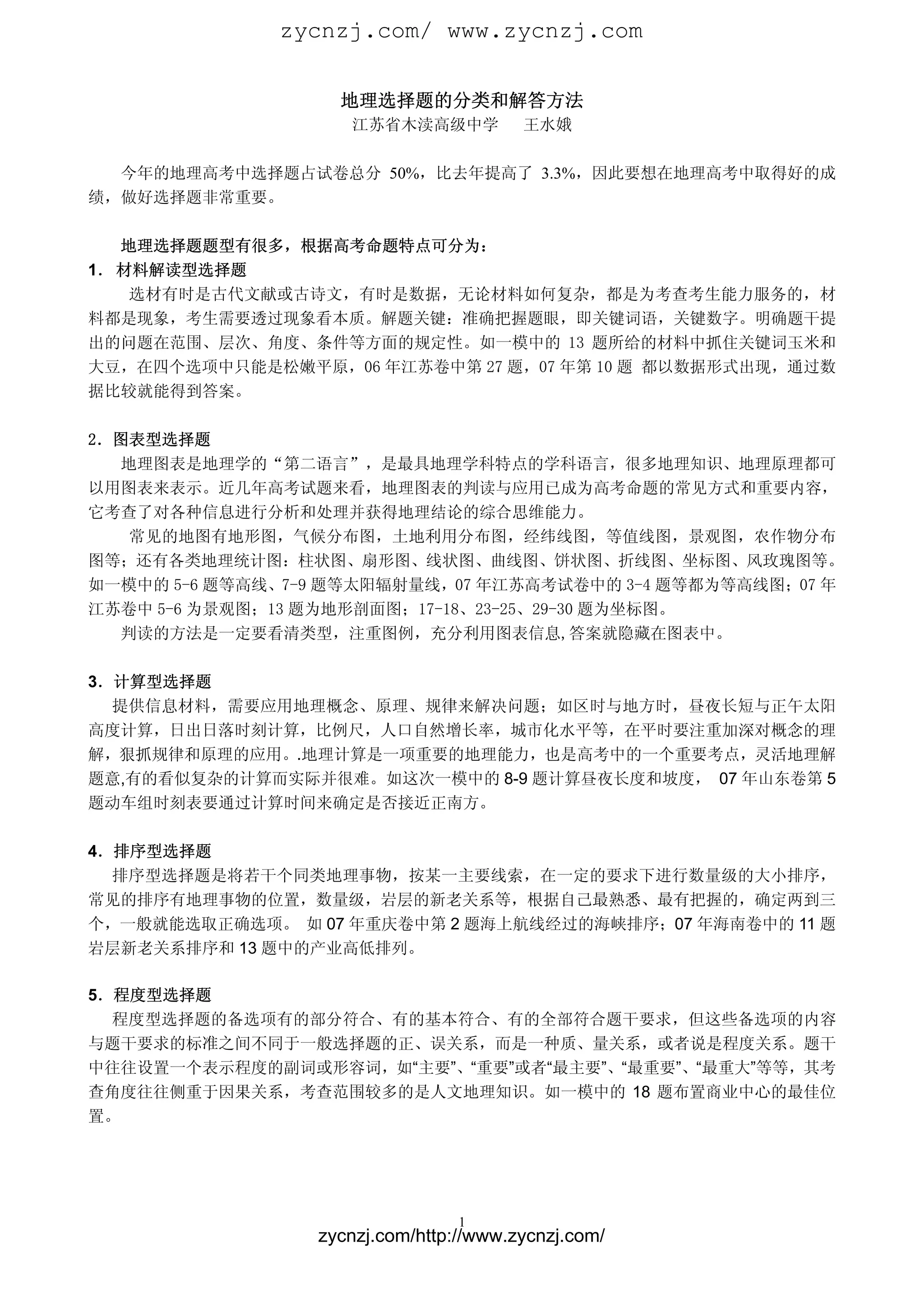 该文档讨论了江苏省地理高考选择题的分类和解答方法,强调了解题技巧的重要性。主要选择题类型包括材料解读型、图表型、计算型、排序型、程度型、组合型和正误型,分别考查考生不同的能力。通过掌握基础知识和应用解题方法,考生能够提高解答选择题的效率和准确性。