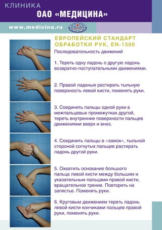 Документ описывает европейский стандарт обработки рук EN-1500, включая последовательность движений для эффективной гигиенической обработки. В нем представлены конкретные шаги, такие как тереть ладони друг о друга, обрабатывать тыльные стороны рук и выполнять вращательные движения. Также упоминается клиника ОАО 'Медицина', что может указывать на контекст применения стандарта.