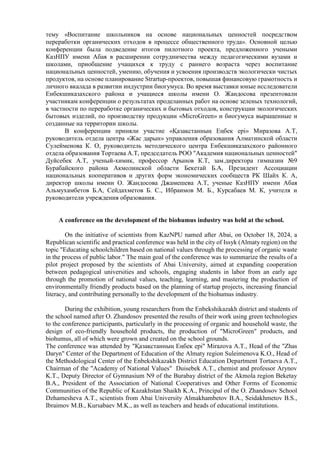On the initiative of scientists from KazNPU named after Abai, on October 18, 2024, a Republican scientific and practical conference was held in the city of Issyk (Almaty region) on the topic "Educating schoolchildren based on national values through the processing of organic waste in the process of public labor." The main goal of the conference was to summarize the results of a pilot project proposed by the scientists of Abai University, aimed at expanding cooperation between pedagogical universities and schools, engaging students in labor from an early age through the promotion of national values, teaching, learning, and mastering the production of environmentally friendly products based on the planning of startup projects, increasing financial literacy, and contributing personally to the development of the biohumus industry.
