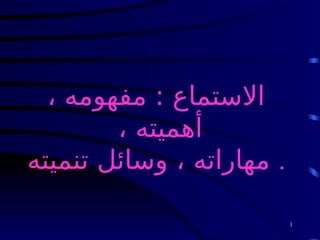 تناقش الوثيقة أهمية مهارة الاستماع في التعليم والتواصل، حيث تعتبر مهارة أساسية لفهم وتفسير الأفكار والمعلومات. كما تشير إلى أن تطوير مهارات الاستماع يمكن أن يتم من خلال أساليب متنوعة في التعليم. تبرز الوثيقة أيضًا كيف تؤثر مهارات الاستماع على الفهم النقدي والتحليل.