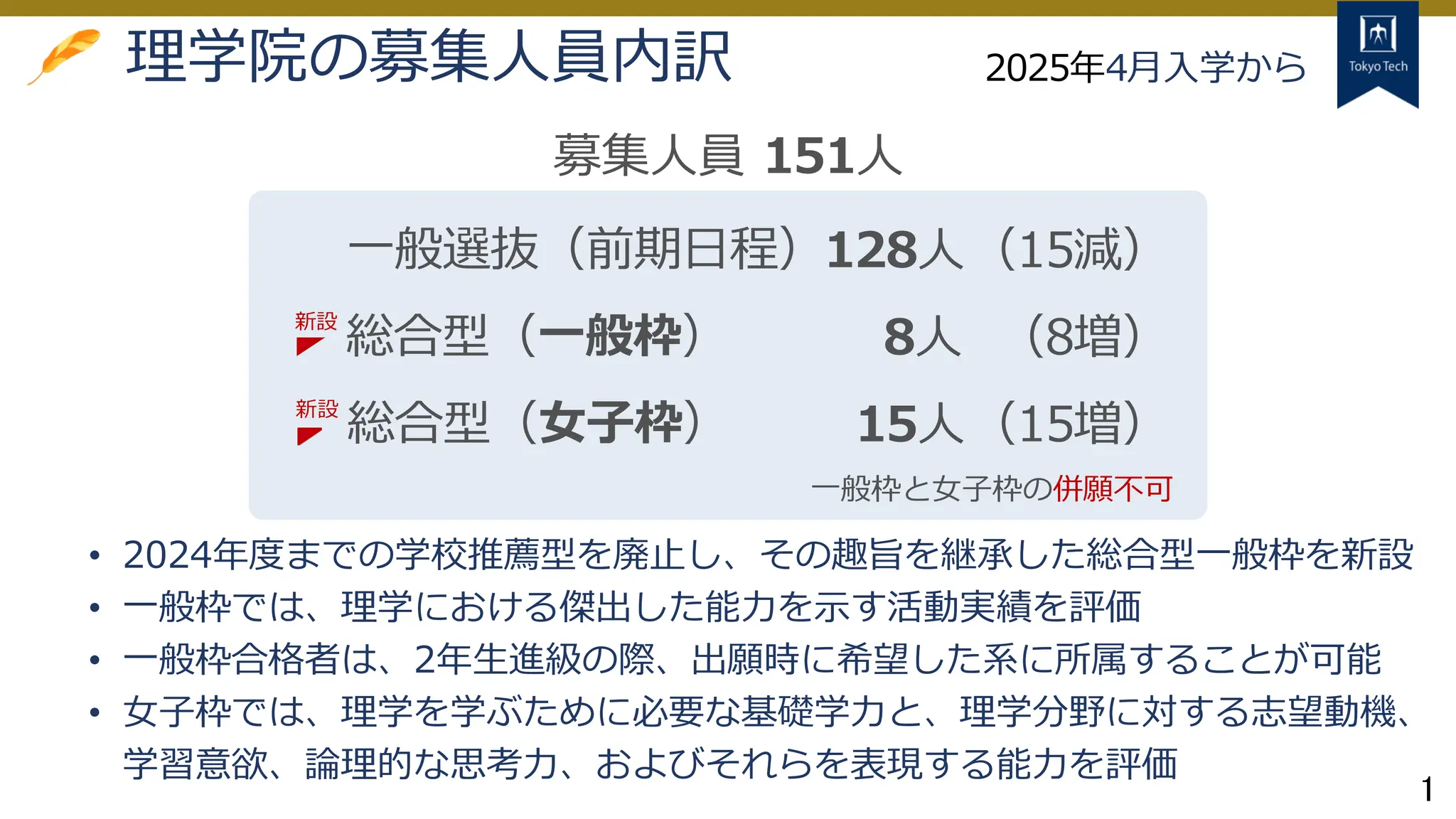 東京工業大学理学院では学院内の多様性を広げるため2025年度入試から、学校推薦型選抜を廃止し、その趣旨を継承した総合型選抜(一般枠)を新設するとともに、新たに総合型選抜(女子枠)を開始します。