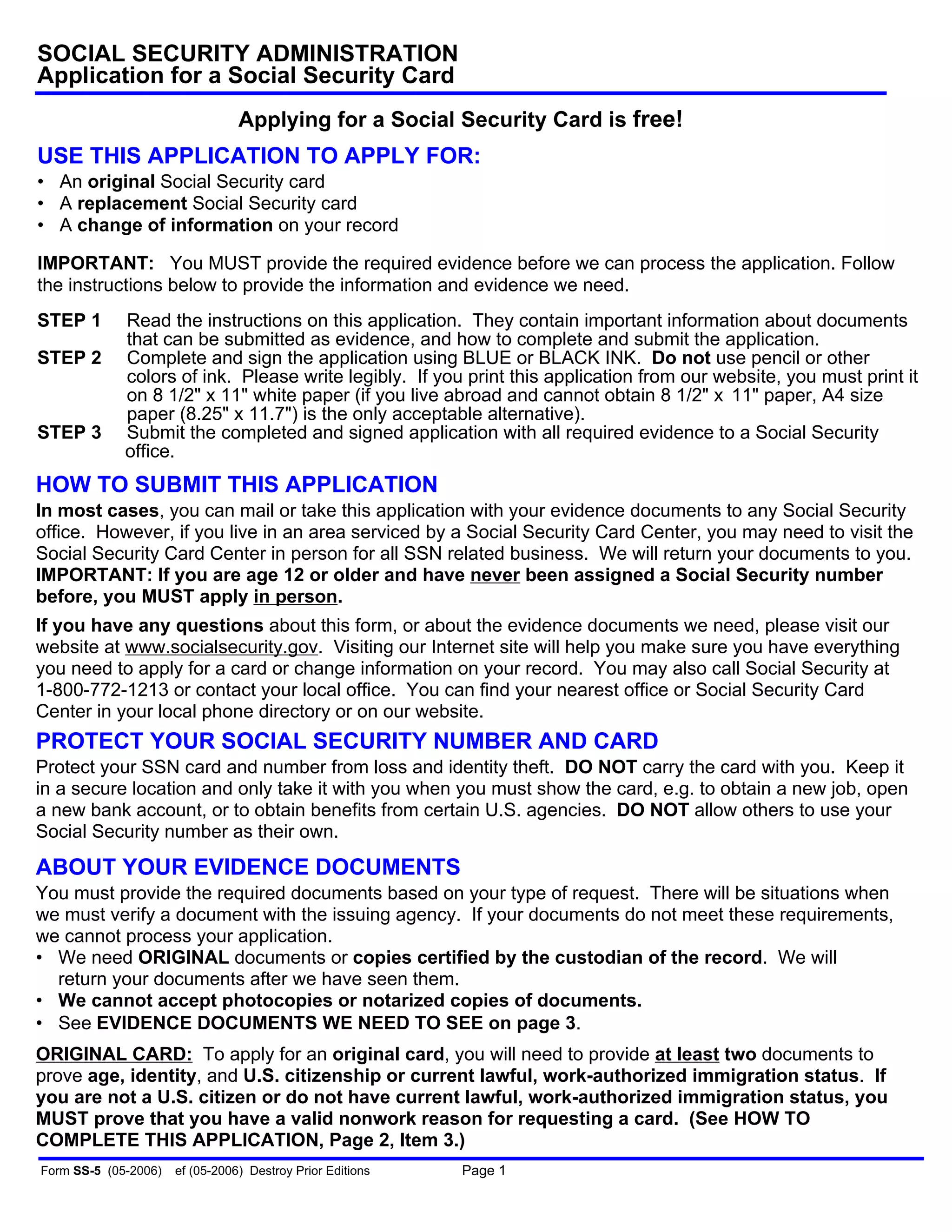 This document provides instructions for applying for an original Social Security card, replacing a lost or damaged card, or updating information on an existing Social Security record. Applicants must submit required documentation to prove their identity, age, and citizenship or immigration status. Acceptable forms of identification include a U.S. birth certificate, passport, driver's license, and immigration documents. The application process is free and can be completed in person at a Social Security office or by mail.