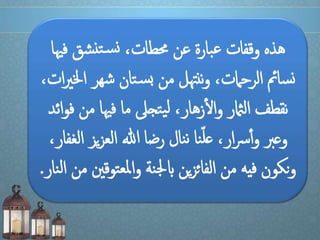 يتحدث المستند عن فوائد وأهمية شهر رمضان، حيث يُعتبر شهرًا للتقرب إلى الله من خلال الطاعات والعبادات. يتناول المستند أيضًا بعض المحطات الرئيسية التي يجب على المسلمين الاستفادة منها خلال هذا الشهر لتحقيق التغيير الروحي وتحسين السلوك. أخيرًا، يُشدد على ضرورة النية الخالصة والعزيمة لتحقيق الأهداف الروحية خلال رمضان.
