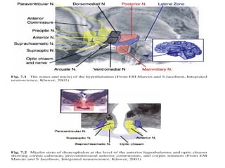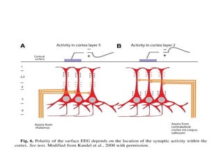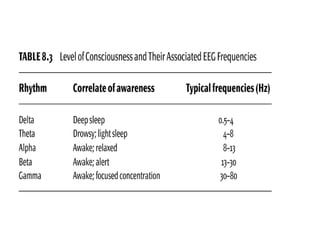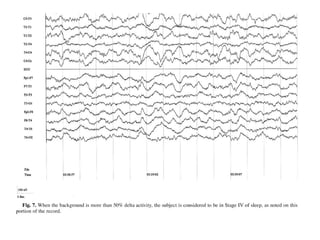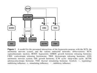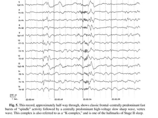 The document discusses biological rhythms and sleep-wake cycles. It describes circadian rhythms controlled by the suprachiasmatic nucleus and influenced by factors like light and temperature. Two drives regulate sleep - a homeostatic drive that increases with wakefulness, and a circadian drive controlled by the suprachiasmatic nucleus. Neurons in the ventrolateral preoptic nucleus promote sleep by inhibiting wake-promoting areas. The document also discusses EEG patterns in different sleep stages, including spindles in stage 2 and delta waves in stage 3. It mentions the role of orexin/hypocretin neurons in maintaining wakefulness and inhibiting REM sleep.