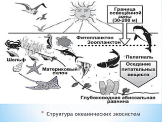 Документ описывает различные морские и пресноводные экосистемы, их биологическое разнообразие и характеристику среды обитания. В частности, он акцентирует внимание на континентальном шельфе как самой богатой области по фауне, а также на продуктивности биомов апвеллинга и эстуариев. Упоминаются условия жизни на больших глубинах и отличие организмов, обитающих в этих экологических зонах.