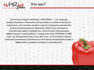 Агентство интернет-рекламы «Паприка» специализируется на продвижении бизнеса в интернете, предлагая широкий спектр услуг, включая разработку стратегий, создание контента, ведение социальных сетей и репутационный менеджмент. С момента своего основания в 2009 году команда профессионалов успешно реализует проекты для клиентов, помогая им адаптироваться к динамичным изменениям в интернет-пространстве. Агентство также обеспечивает проведение исследований и предоставляет услуги по интернет-рекламе, созданию и продвижению сайтов.