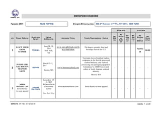 This document lists 14 trade shows that will take place in New York City in 2013-2016. It provides details on each show such as the industry it relates to, dates, location, website, and general comments. The shows cover a wide range of industries including food, seafood, apparel, accessories, gifts, stationery, tableware, boating, dentistry, and hotels/restaurants. Attendance numbers are provided for some of the larger shows, with the largest expected to attract over 80,000 visitors. No Greek exhibitors or visitors are listed for any of the years provided.