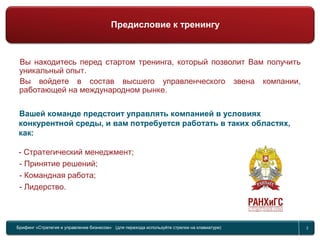 Документ представляет собой брифинг по тренингу по стратегии и управлению бизнесом в рамках глобального управленческого соревнования. Участникам необходимо будет организовать команду, разработать стратегию и принимать решения по управлению компанией в условиях конкуренции, анализируя результаты и учитывая рыночные условия. Важным элементом является изучение управленческих отчетов и маркетинговых исследований для достижения успеха в соревновании.