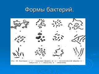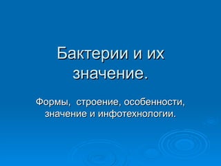 Документ рассматривает бактерии, их формы, строение и значение, включая особенности клеточной мембраны и оболочки, которые в основном состоят из полисахаридов, белков и липидов. Описывается процесс размножения бактерий и формирования спор в неблагоприятных условиях, а также наличие патогенных бактерий, выделяющих токсины. В плазмидах содержатся гены, отвечающие за обмен веществ и синтез энзимов.