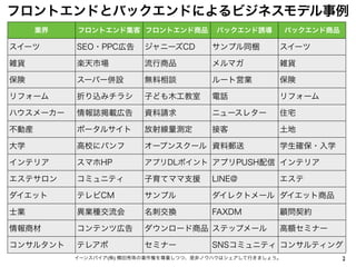 フロントエンドとバックエンドによるビジネスモデル事例 2イーンスパイア(株) 横田秀珠の著作権を尊重しつつ、是非ノウハウはシェアして行きましょう。 業界 フロントエンド集客