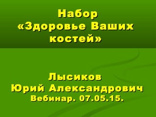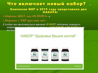 Компания NSP в 2015 году представила набор «Здоровье костей», направленный на поддержку здоровья костной системы и профилактику остеопороза, который является системным заболеванием, приводящим к снижению прочности костей и повышению риска переломов. Остеопороз может проявляться бессимптомно, и его первичным признаком часто становится перелом, а факторы риска включают генетическую предрасположенность, образ жизни и физиологические характеристики организма. Витамин D играет важную роль в усвоении кальция и поддержании здоровья костей, увеличивая его всасывание в ЖКТ и активность остеокластов.
