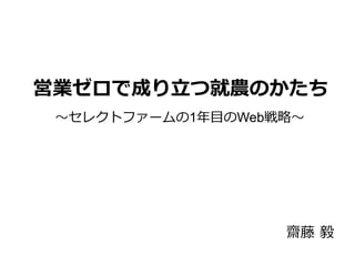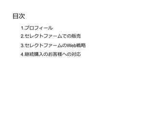 セレクトファームのWeb戦略4 ブログに注力していたので、農場の便り等の情報は必要なく、 さらにメディア対策へも効果があった 集客とリピータ率にブログ運営は効果的だった (ただし、書き方による)