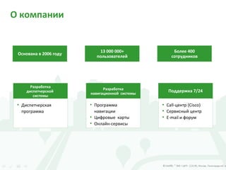 Документ описывает компанию Navitel, занимающуюся разработкой высокотехнологичных навигационных и диспетчерских систем, которая обслуживает более 13 миллионов пользователей. В документе представлены функции и преимущества программного обеспечения, включая мониторинг транспортных средств, создание геозон, отчеты и интеграцию с другими системами, такими как 1C и Navitel Navigator. Также описаны доступные языковые версии интерфейса, технические возможности и контактная информация для обучения и поддержки пользователей.