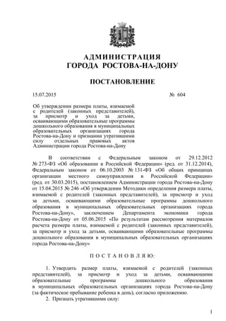Постановление администрации города Ростова-на-Дону от 15.07.2015 № 604 утверждает размер платы за присмотр и уход за детьми, посещающими дошкольные образовательные программы в муниципальных учреждениях. Установлены тарифы в зависимости от возраста ребенка и продолжительности пребывания, причем плата не взимается с детей-инвалидов и сирот. Документ также отменяет несколько ранее действующих постановлений по данному вопросу.