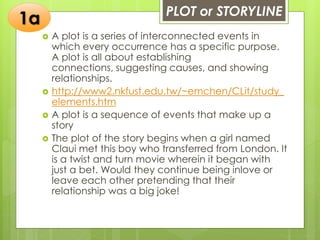 The document discusses key elements of literary plots including exposition, rising action, climax, falling action, and resolution. It provides definitions and examples for each element. The document is a student assignment where the student describes applying these plot elements to analyze their own life experiences, noting how everyone has different stories and can relate parts of their own lives to various parts of a plot structure. The student discusses learning about how to correlate real life experiences to literary plot devices.