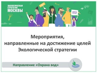 Документ описывает мероприятия по реализации экологической стратегии в Москве, направленные на охрану вод и улучшение состояния водоемов. Основные меры включают принятие законов, восстановление и реабилитацию водных объектов, создание систем водоснабжения и водоотведения, а также контроль за загрязнением и несанкционированными зонами отдыха. Также предусмотрены модернизация очистных сооружений и развитие сапрофитных и охранных норм для водных объектов.