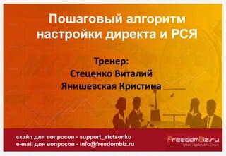 Документ описывает пошаговый алгоритм настройки Яндекс.Директа и РСЯ, включая советы по поисковым кампании и ретаргетингу. Участники вебинара получат доступ к практическим рекомендациям, основанным на опыте экспертов с многолетним стажем в интернет-бизнесе. В результате обучения участники смогут самостоятельно запускать и оптимизировать рекламные кампании для повышения эффективности.
