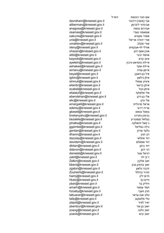 יובלysteinitz@knesset.gov.il יולי-אדלשטיין יואלyedelstein@knesset.gov.il יונה יוסיyosefyo@knesset.gov.il ג יוסף`באריןJabareen@knesset.gov.il מגל ינוןymagal@knesset.gov.il גרמן יעלygerman@knesset.gov.il ליצמן יעקבylitzman@knesset.gov.il מרגי יעקבymargi@knesset.gov.il פרי יעקבypery@knesset.gov.il ביטון שאשא יפעתyifatsh@knesset.gov.il הרצוג יצחקiherzog@knesset.gov.il וקנין יצחקyvaknin@knesset.gov.il כהן יצחקizchakec@knesset.gov.il מזוז ירוןymazuz@knesset.gov.il לוין יריבylevin@knesset.gov.il אייכלר ישראלieichler@knesset.gov.il כץ ישראלyiskatz@knesset.gov.il כהן מאירcohenmeir@knesset.gov.il פרוש מאירmporush@knesset.gov.il אורן מיכאלmichaels@knesset.gov.il בירן מיכלmbiran@knesset.gov.il רוזין מיכלmrozin@knesset.gov.il לוי מיקיmickeylevy@knesset.gov.il רוזנטל מיקיmrosenthal@knesset.gov.il בן מירב-אריbmerav@knesset.gov.il רגב מיריmregev@knesset.gov.il זוהר מיקי מכלוףmahlufz@knesset.gov.il טרכטנברג מנואלmanuelt@knesset.gov.il מוזס אליעזר מנחםmmozes@knesset.gov.il גנאים מסעודmganaeim@knesset.gov.il מיכאלי מרבmichaelim@knesset.gov.il יוגב מרדכיmyogev@knesset.gov.il גפני משהmgafni@knesset.gov.il יעלון משהmyaalon@knesset.gov.il כחלון משהcmoshe@knesset.gov.il נהרי משולםmnahari@knesset.gov.il בוקר נאוהnboker@knesset.gov.il קורן נוריתnkoren@knesset.gov.il שי נחמןnshai@knesset.gov.il סלומינסקי ניסןnslomiansky@knesset.gov.il בנט נפתליnbenet@knesset.gov.il לנדבר סופהslandver@knesset.gov.il שלום סילבןsshalom@knesset.gov.il שפיר סתיוsshaffir@knesset.gov.il סלימאן תומא עאידהaidat@knesset.gov.il חאג אלחכים עבד`יחיאabedh@knesset.gov.il מערוף אבו עבדאללהabdallaa@knesset.gov.il פריג עיסאווי`ifarig@knesset.gov.il לביא עליזהalavie@knesset.gov.il פרץ עמירaperetz@knesset.gov.il בר עמר-לבobarlev@knesset.gov.il