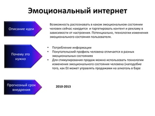 Документ описывает концепцию 'эмоционального интернета', технологии которого могут распознавать эмоциональное состояние пользователя для таргетирования контента и рекламы. Идея заключается в том, что эмоциональное состояние влияет на покупательский профиль, что открывает возможности для продажи через изменение настроения. Прогнозируемый срок внедрения данной технологии — с 2010 по 2013 годы.