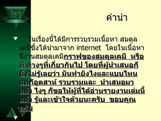 คำนำ ในเรื่องนี้ได้มีการรวบรวมเนื้อหา สมดุลเคมีซึ้งได้นำมาจาก internet โดยในเนื้อหามีงานสมดุลเคมี กราฟของสมดุลเคมี หรือที่ ต่างๆที่เกี่ยวกันไป โดยที่ผู้นำเสนอก็ยังไม่รู้เลยว่า มันทำยังไงและแบบไหน แต่ก็อุตสาห์ รวบรวมและ นำเสนอมาแล้ว ไงๆ ก็ขอให้ผู้ที่ได้อ่านรายงานเล่มนี้ แล้ว รู้และเข้าใจด้วยนะครับ ขอบคุณครับ N Near โชติช่วง ดีดวงพันธ์ - 3.