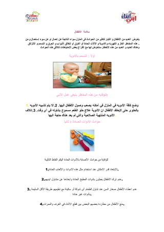 تتناول الوثيقة المخاطر التي يتعرض لها الأطفال في المنزل وتقديم اقتراحات للوقاية من حوادث مثل التسمم، الحوادث الناتجة عن الأدوات الحادة، والانغلاقات عند الأبواب. تشمل الإجراءات الوقائية تنظيم الأدوية بعيدًا عن متناول الأطفال، واستخدام أدوات حادة بحذر، وضمان سلامة الأبواب لعدم إصابة الأطفال. كما تناقش الوثيقة المخاطر المتعلقة بالمواد الكيميائية والغاز وتأثيرها على سلامة الأطفال.