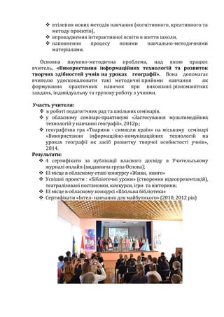 творчих здібностей учнів на уроках географії». Вона допомагає