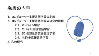 これは、発表の内容(ないよう)です。まず、コンピューター支援(しえん)言語(げんご)学習(がくしゅう)の定義(ていぎ)について説明します。二つ目(ふたつめ)に、コンピューター支援(しえん)言語(げんご)学習(がくしゅう)の研究の種類(しゅるい)について説明(せつめい)します。最後(さいご)に、わたしの研究についてお話します。