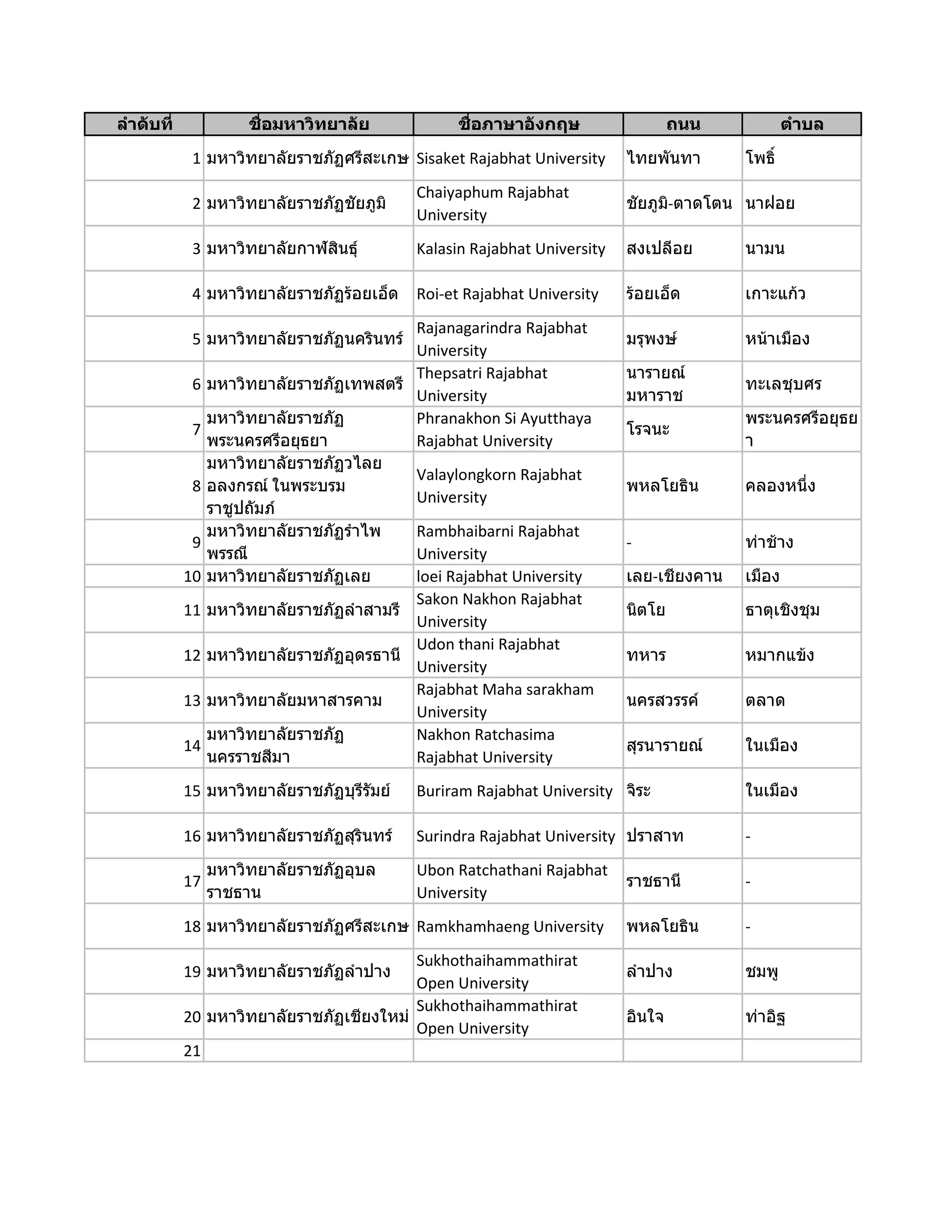เสาวลักษณ์ 1. ลำดับที่ ชื่อมหำวิทยำลัย ชื่อภำษำอังกฤษ ถนน ตำบล