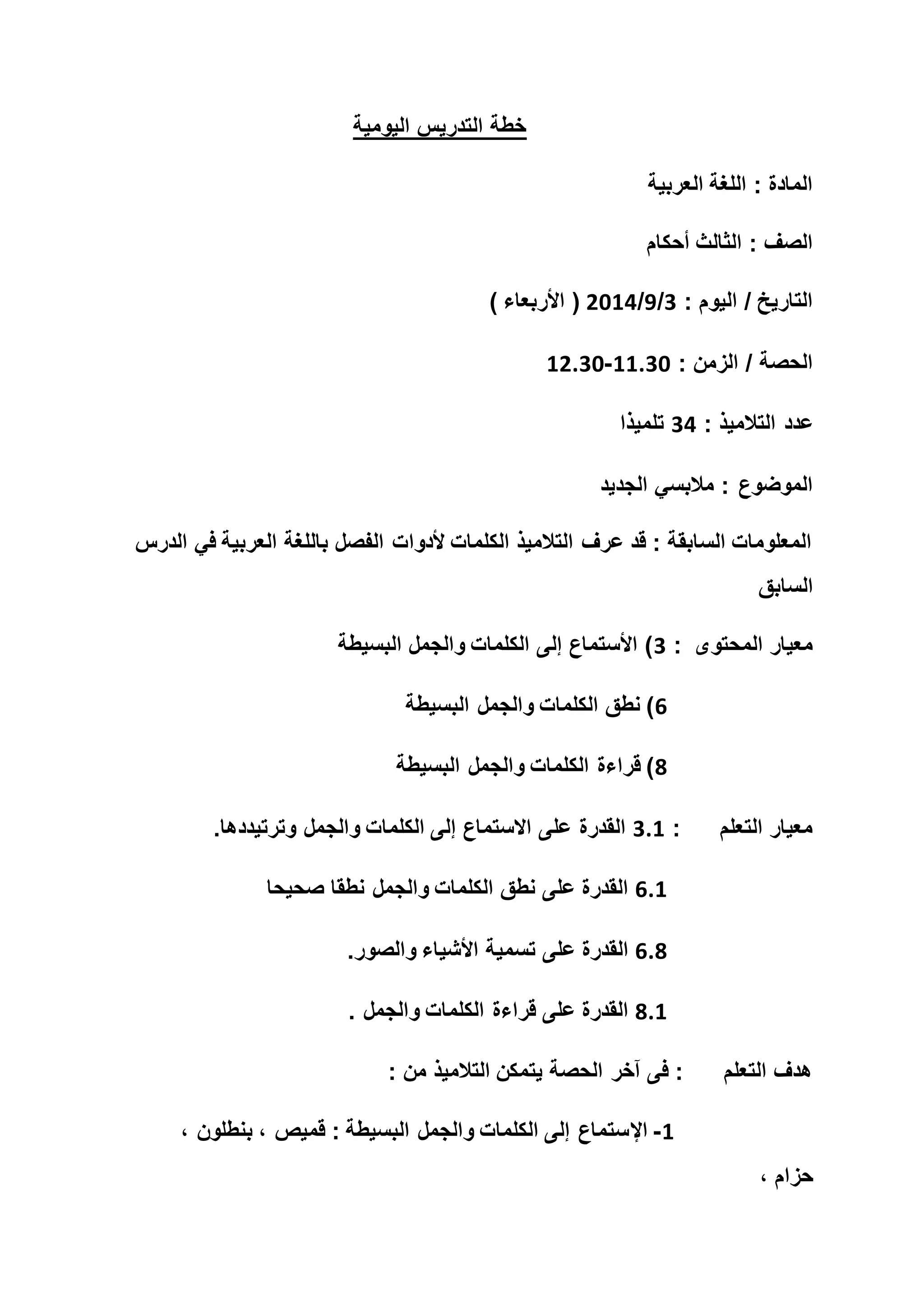 تتناول خطة الدرس لمادة اللغة العربية للصف الثالث موضوع أدوات الملابس والكلمات المتعلقة بها، حيث يهدف الدرس إلى تحسين مهارات الاستماع والنطق والقراءة عند التلاميذ. يتضمن الدرس أنشطة متنوعة مثل الاستماع، القراءة الجماعية والفردية، وممارسة النطق الصحيح للكلمات والجمل المرتبطة بالموضوع. كما يشمل الدرس التأكيد على القيم النبيلة مثل الاجتهاد والشجاعة.