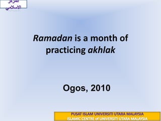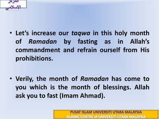 Ramadan is a month of practicing self-discipline and righteousness. It is a month of blessings where Muslims increase their faith and piety through fasting, avoiding sins and following Allah's commands. Fasting helps develop taqwa or God-consciousness and shields people from committing sins. During Ramadan, the doors of heaven are opened and the doors of hell are closed. It is a month to purify oneself both internally through controlling desires and externally through what enters the body.