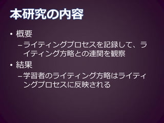 草薙邦広・阿部大輔・福田純也・川口勇作 (2015). 「学習者のライティングプロセスを記録・可視