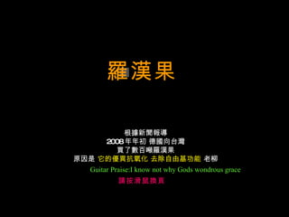 文档讨论了罗汉果的抗氧化特性和健康益处,包括预防及舒缓多种疾病,如糖尿病和高血压。通过对罗汉果的介绍和相关病例,强调其在现代人日常生活中的保健应用。罗汉果茶的制作方法和适宜的摄取方式也得到了详细说明,突出其在自然健康疗法中的重要性。