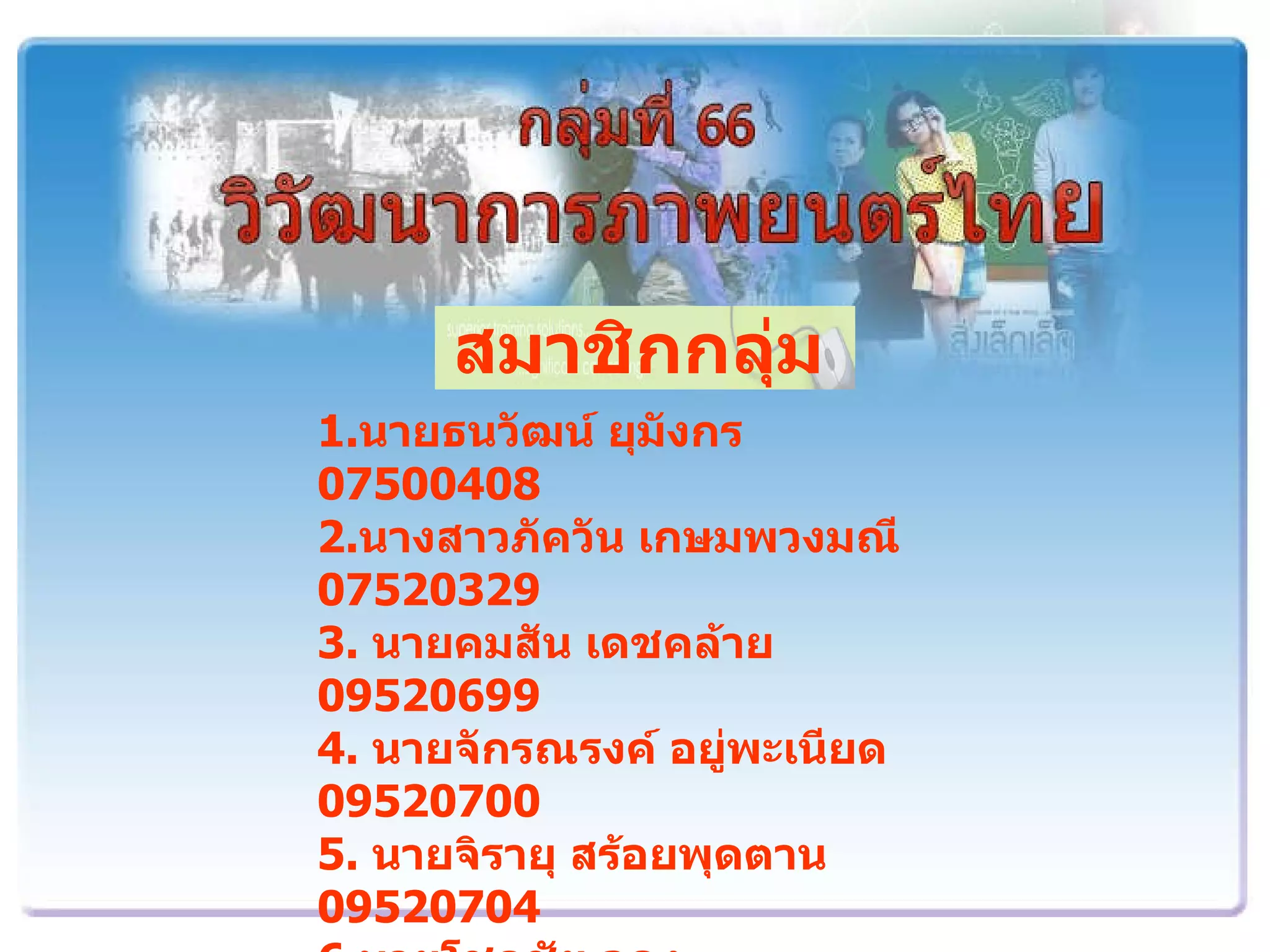 สมาชิกกลุ่ม 1. นายธนวัฒน์ยุมังกร 07500408 2. นางสาวภัควัน เกษมพวงมณี 07520329 3. นายคมสัน เดชคล้าย 09520699 4. นายจักรณรงค์ อยู่พะเนียด 09520700 5. นายจิรายุ สร้อยพุดตาน 09520704 6. นายโชคชัย อุดง 09520715 7. นายนวศิลป์ ศรีหาคุณ 09520745 8. นายธนภัทร นัยเพียร 09520733 9 . นายรัฐวิทย์ จันทร์ศร 09520786 - 2.