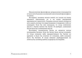 Документ обсуждает неклассическую философскую антропологию, отказывающуюся от традиционных представлений о человеке, акцентируя внимание на сложности его бытия, сознания и самосознания. Основные идеи включают концепцию о том, что человеческое бытие не всегда осознано и не может быть полноценно выражено через социальные или физические меры. В отличие от классической философии, автор подчеркивает, что мышление и реальность глубоко взаимосвязаны, создавая пространство для новых подходов к пониманию смысла и значения.