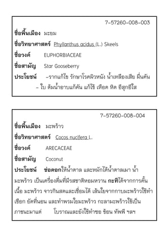 ผักเป.ดฝรั่ง , ผักโหมแดง ชื่อวิทยาศาสตร Alternanthera bettzickiana (Regel) G.Nicholson ชื่อวงค AMARANTHACEAE ชื่อสามัญ Joy weed. ประโยชน ทั้งต1น รับประทานเป.นผักชJวยขับน้ํานม ต1มกับน้ํา รับประทานเป.นยาแก1ไข1 ตําพอกรักษาแผล 7-57260-008-031 ชื่อพื้นเมือง เศรษฐีไซงJอน ชื่อวิทยาศาสตร Ophiopogon jaburan (Kunth) Lodd. var. argenteus ชื่อวงค CONVALLARIACEAE ชื่อสามัญ Variegated mondo grass, White lilyturf ประโยชน ปลูกเป.นไม1ประดับ