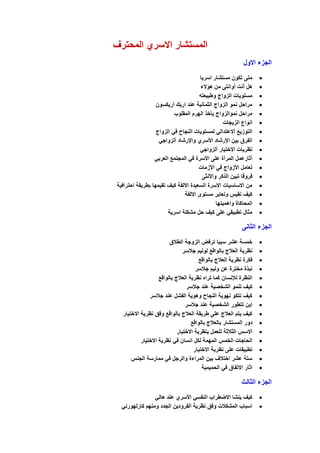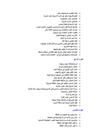 يتناول الوثيقة مواضيع تتعلق بالعلاقات الزوجية والأسرة، مثل مراحل الزواج وأسباب الأزمات الزوجية وتأثير العمل على المرأة والأسرة. كما يتطرق إلى استراتيجيات تعزيز العلاقات والاختيار العاطفي بين الزوجين، بالإضافة إلى تحليل العوامل النفسية والمجتمعية التي تؤثر على الزواج. تشمل الوثيقة أيضًا نصائح للتعامل مع المشاكل الزوجية وطرق تحسين التفاهم بين الأزواج.