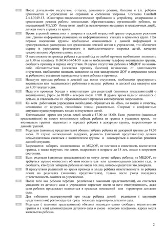 Документ содержит правила и рекомендации для родителей, касающиеся посещения детского сада, включая требования по медицинским справкам после отсутствия и порядок уведомления воспитателя о приходе и уходе детей. Также описаны режим дня, организация образовательного процесса, правила безопасности и режим питания, с описанием обязанностей родителей по обеспечению безопасности и дисциплины детей. В документе предусмотрены меры по предотвращению конфликтов и обязанностей как воспитателей, так и родителей.