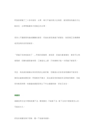 文档介绍了如何挑选新鲜和安全的蔬菜水果,强调选择有虫的蔬菜和带酸味的水果比较安全。作者阿发依据自己二十年的种植经验,建议通过手感和外观来判断蔬菜的口感与新鲜度,同时警示消费者避免购买喷过化学药品的水果。提供了具体的挑选技巧,如高丽菜、玉米和水果的选择标准。