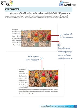 2010 1 การปรับขนาดภาพ รูปภาพบางภาพที่นามาใช้งานนั้น บางครั้งอาจจะมีขนาดใหญ่หรือเล็กเกินไป ทาให้ดูไม่สวยงาม แต่ เราสามารถปรับขนาดของภาพ ไม่ว่าจะเป็นการย่อหรือขยายภาพตามความเหมาะสมซึ่งมีขั้นตอนดังนี้ 2 2 คลิกเลือกภาพที่ ต้องการปรับขนาด 1 3 2 เลื่อนเมาส์ไปวางบนจุด วงกลมซึ่งจะอยู่บริเวณมุม ของภาพ จากนั้นแดรก เมาส์เพื่อย่อขยายรูปภาพ เมื่อได้ขนาดรูปตาม ต้องการ จึงปล่อยเม้าส์