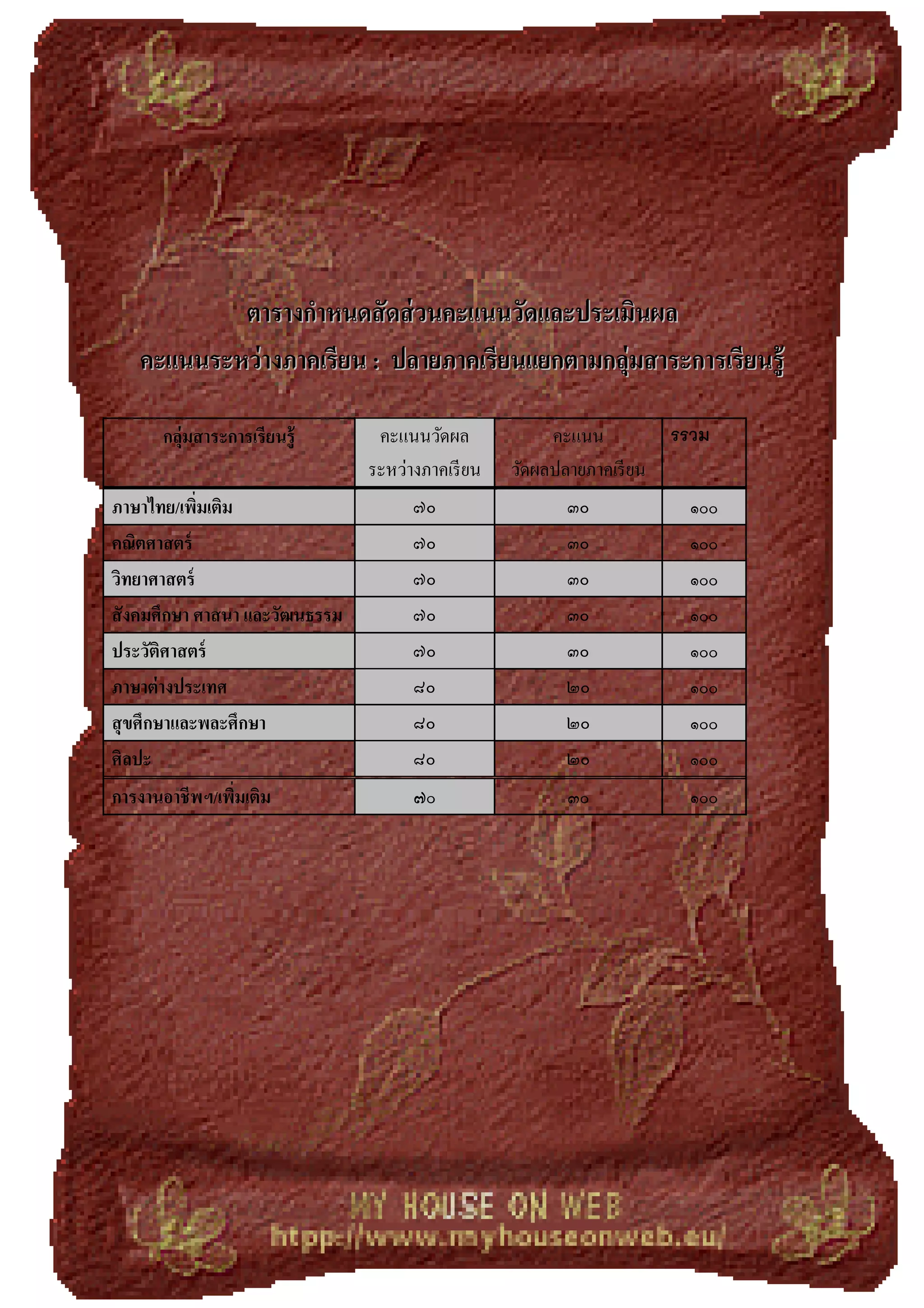 คะแนนระหว่ างภาคเรียน : ปลายภาคเรียนแยกตามกลุ่มสาระการเรียนรู้ กลุ่มสาระการเรียนรู้ คะแนนวัดผล คะแนน รรวม ระหว่างภาคเรี ยน วัดผลปลายภาคเรี ยน ภาษาไทย/เพิมเติม ่ ๗๐ ๓๐ ๑๐๐ คณิตศาสตร์ ๗๐ ๓๐ ๑๐๐ วิทยาศาสตร์ ๗๐ ๓๐ ๑๐๐ สั งคมศึกษา ศาสนา และวัฒนธรรม ๗๐ ๓๐ ๑๐๐ ประวัติศาสตร์ ๗๐ ๓๐ ๑๐๐ ภาษาต่ างประเทศ ๘๐ ๒๐ ๑๐๐ สุ ขศึกษาและพละศึกษา ๘๐ ๒๐ ๑๐๐ ศิลปะ ๘๐ ๒๐ ๑๐๐ การงานอาชีพฯ/เพิมเติม ่ ๗๐ ๓๐ ๑๐๐