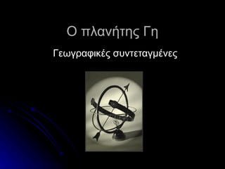 Γεωγραφικές συντεταγμένες Γεωγραφικόμήκος Γεωγραφικό πλάτος Η απόσταση ενός τόπου από τον Ισημερινό λέγεται γεωγραφικό πλάτος Η απόσταση ενός τόπου από τον 1ο Μεσημβρινό λέγεται γεωγραφικό μήκος