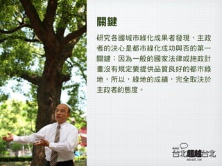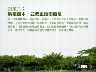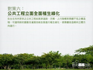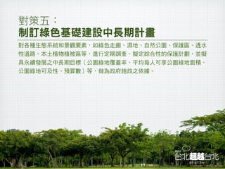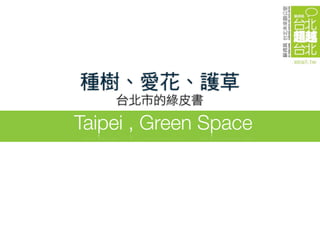 Taipei has over 1,000 hectares of green space with an average of 5.19 square meters per person, less than half of international standards. While green space as a percentage of total area increased slightly in recent years, it remains below targets and disparities exist between districts, with some having less than half the green space of others. Plans aim to plant over 200,000 new trees and increase total green space by 200 hectares by 2025.