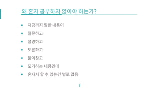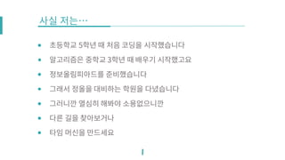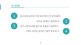 2015년 8월 29일 강남역 네이버 D2에서 열린 SOCC 6th Conference 에서 발표한 자료입니다. 첫 번째로는 많은 사람들이 언제 처음 공부를 시작했는지를 중요하게 생각하는데, 어떻게가 더 중요하다는 점을 강조하고자 했습니다. 두 번째로는 내가 어떻게 공부를 했었는지에 대한 방법을 소개했습니다. 마지막으로 신기한 방법으로 두 문제를 풀어봅니다. https://www.acmicpc.net/problem/9457 https://www.acmicpc.net/problem/2329