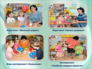 Документ описывает опытно-экспериментальную деятельность дошкольников как способ повышения их познавательной активности, включая различные игры и эксперименты. Он выделяет необходимость создания условий для детского экспериментирования и включает методические разработки, направленные на развитие исследовательского интереса у детей. Также рассматриваются методы и формы организации такой деятельности, включая сотрудничество с родителями и использование развивающей предметно-пространственной среды.