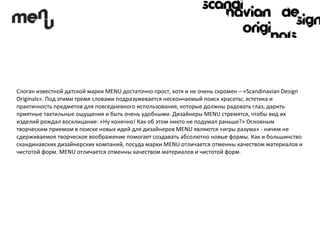 Датская марка menu предлагает элегантные и функциональные изделия, которые сочетают в себе скандинавский дизайн и высокое качество материалов. В их ассортимент входят наборы для вина, охлаждающие чехлы и штопоры, разработанные дизайнером Якобом Вагнером, которые обеспечивают идеальные условия для наслаждения вином. Также марка collaborates с другими известными дизайнерами, создавая уникальные предметы интерьера и кухонной утвари, отмеченные международными наградами.