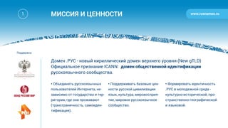 Домен .рус представляет собой новый кириллический домен верхнего уровня, призванный объединить русскоязычное сообщество и поддерживать его культурные ценности. Регистрация начинается 3 сентября 2015 года с разными приоритетными периодами для различных категорий пользователей. Сайт rusnames.ru предоставляет всю необходимую информацию для регистрации и поддержки сообщества.